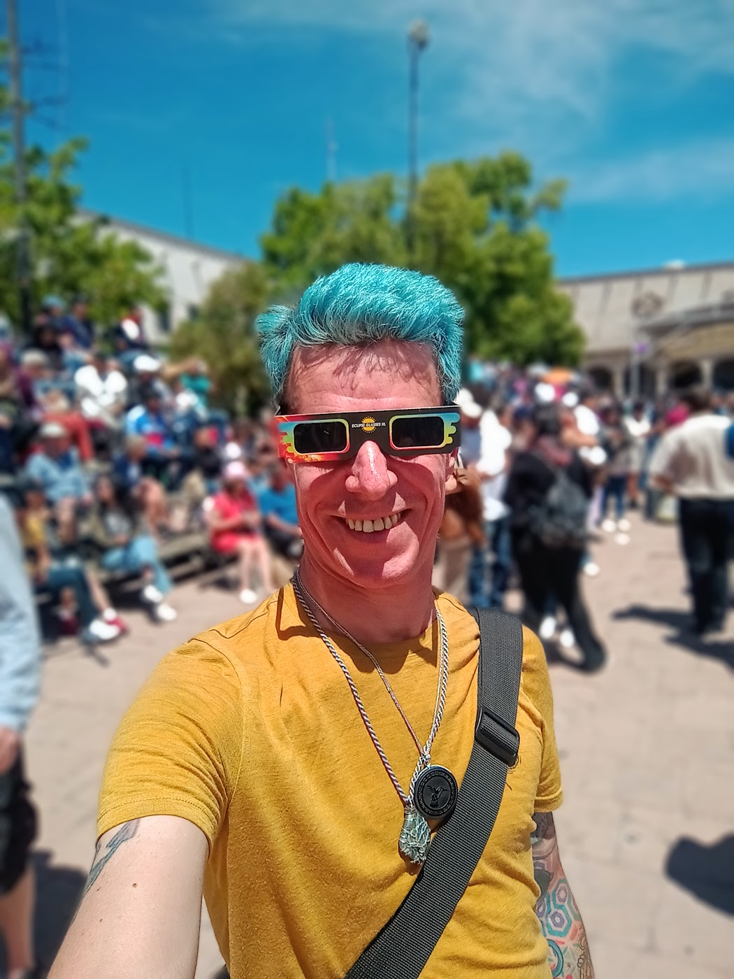 All morning Plaza IV Centenario in Durango has been filled as if for a festival. Earlier, a shockingly youthful shaman led a salute to the sun and then gave copal cleansings to a patient queue of hundreds. Local news crews interview anyone and everyone. The chatter feels like nervous laughter before a curtain rises, and we’re all taking selfies in our cardboard eclipse spectacles. I also try peering at the sun through my obsidian medallion, bought the previous week from a hawker in the shadow of the Pyramid of the Sun at Teotihuacan. The modern version is more effective, but the obsidian feels truer to the moment.