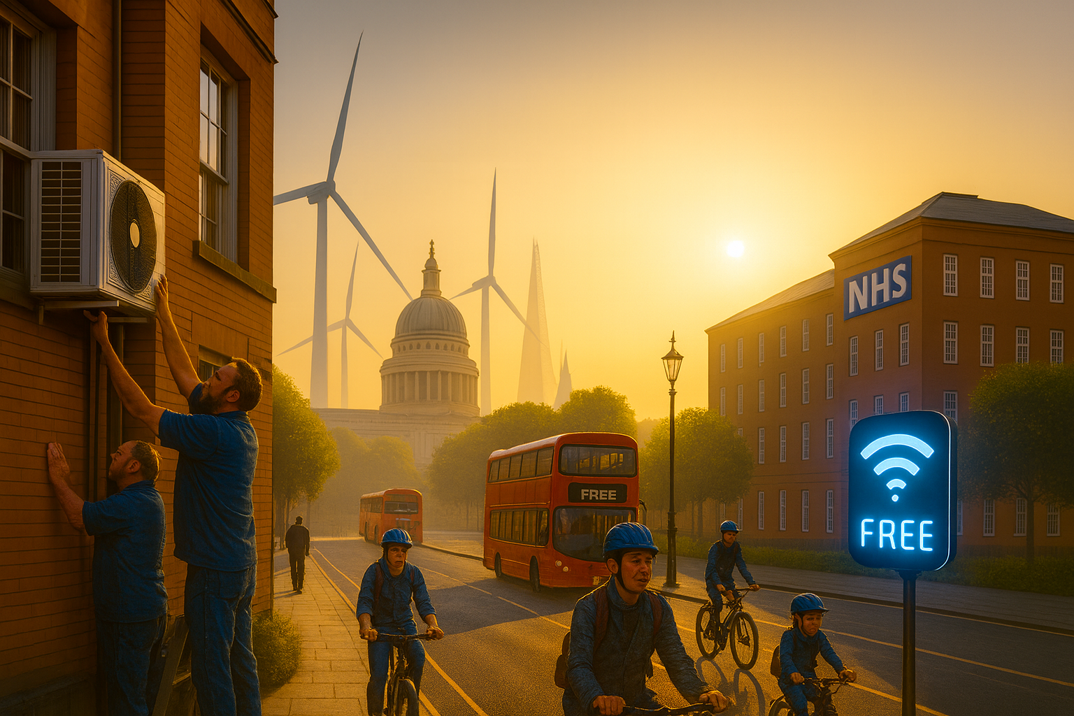 Phase 1 — Flip the money story (0–5 years). Tell the truth in public: governments don’t run out of pounds; they run out of nurses, installers and grid capacity. Launch Job Guarantee pilots via councils and community organisations. Start the NHS‑style expansion where electrotech makes it easiest: free city transport on clean power, baseline broadband, and a public energy allowance at zero price during surplus hours.